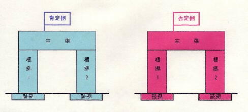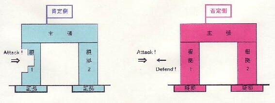ディベートの方法 英語を勉強している方々は、どこかでディベートという言葉を聞いたことがあると思います。 ディベートというのは、 「ある論題について肯定側と否定側に分かれ、一定のルールの下に議論をするゲーム」 です。ディベートは、論理的な思考力やコミュニケーション能力を身につけていくための有効な トレーニングになります。また英語力の向上にも非常に有効で、私自身もいわゆる英会話の 様々な練習法を試みるなかで、ディベートが最も有効だと考えるようになりました。 ディベートというと何やら難しそうなものに感じるかもしれませんが、日本語でなら小学生も やっており難しいものではありません。話があっちこっちに飛んだり、一部の人だけが独占状 態で話したりということが無いので、方法がわかってしまえばむしろディスカッションより参加も 進行も簡単です。中上級者向けの英語サークル等ではディベートを実施することも多いので、 その基本的な方法をまとめました。 T 議論の基本 1.議論の構造 ディベートは「議論をするゲーム」ですから、まず議論の構造を知ってください。議論の基本的 な構造は単純です。議論は「主張」とそれを支える「根拠」からできています。そして、それに 「証拠」が伴えば根拠は強くなります。これだけです。 ![]() 2.議論の方法 (1)主張する時 意見がわかれる問題を議論している時に「ダメだからダメ!」と言ってもだれも納得してくれま せん。上の図に示したように、主張をする時には根拠が必要なのです。 したがって、自分がなにか主張したい時には以下のように言うのが基本です。 @主張…「私たちは日本の裁判制度に陪審員制を導入することを主張します。」 A根拠…「その根拠は○○○です。」 B証拠…「そして、このような証拠資料があります。」 (2)反論する時 根拠が無くなれば、もはやその主張はできません。したがって、相手の主張に反論したい時 はその根拠を攻撃すればいいのです。 同様に、こちらの根拠を守ればその主張は成立することになります。 ![]() U ディベート 1.構成要素 皆さんが会議で議論をするときには「自分の考えを主張」したり、聞いていてわからないこと を「質問」したり、相手が言ったことに「反論」したりしますよね。ディベートは議論ゲームですか ら同様に「主張(=立論)」、「質問」、「反論」という三つの部分から成り立っています。そし て、最後に審判が判定をくだします。 (1)立 論 自分たちの主張が正しいということを根拠を示して述べます。新しい政策や試みが論題とな った場合には、 ・肯定側の根拠は、その新しい政策や試みを実施することによって生じるメリット ・否定側の根拠は、その新しい政策や試みを実施することによって生じるデメリット となります。 例えば「学校の制服は廃止すべきである」という論題なら、次のような立論が考えられます。 《肯定側》 @主張…「学校の制服は廃止すべきです。」 A根拠…「なぜなら制服によって生徒の個性が失われているので、制服を廃止す れば生徒の個性を伸ばすというメリットを得られるからです。」 《否定側》 @主張…「学校の制服は廃止すべきではありません。」 A根拠…「なぜなら、制服によって規律が守られているので、制服を廃止すれば学 校の規律が乱れるというデメリットが生じるからです。」 ※英語ディベートでは通常"Merit", "Demerit"ではなく、"Advantage", "Disadvantage"が用い られます。 ※数ヶ月前に論題が発表されるディベートでは証拠資料が重要ですが、英語サークルなどで はその場で論題が出され、証拠資料無しでおこなう即興型が多いので、ここでは証拠資料の 部分は省略します。 (2)質問(尋問とも言います) 相手の立論を聞いて、わからなかったところを確認するために質問します。相手の主張の矛 盾点を突いたりもします。 (3)反論(反駁・はんばく) 相手の主張に対して反論します。また、相手の反論に対して自分の主張を守ります。例えば 以下のようになります。 《肯定側》「否定側は、制服を廃止すれば規律が乱れると言いましたが、着ているもので授業 態度等が変わってくるものではありません。したがって制服廃止で規律が乱れるとい うデメリットは生じません。」 《否定側》「肯定側は、制服廃止によって個性が伸ばせると言いましたが、実際には着ているも のが同じでも考え方は様々で、個性的な人も大勢います。したがって制服廃止で個 性が伸ばせるというメリットは得られません。」 【判定】 最後に中立の立場の審判が最後に肯定側、否定側どちらが勝ったか判定を下します。ディ ベートでは相手をやりこめることではなく、審判を説得することが目標となります。 2.ディベートの形式 議論がフェアであるためには、肯定側・否定側の双方に平等に主張と反論の機会が保証さ れなければなりません。したがって、ディベートにはいくつかの形式がありますが、いずれもそ の順番と時間が決めら